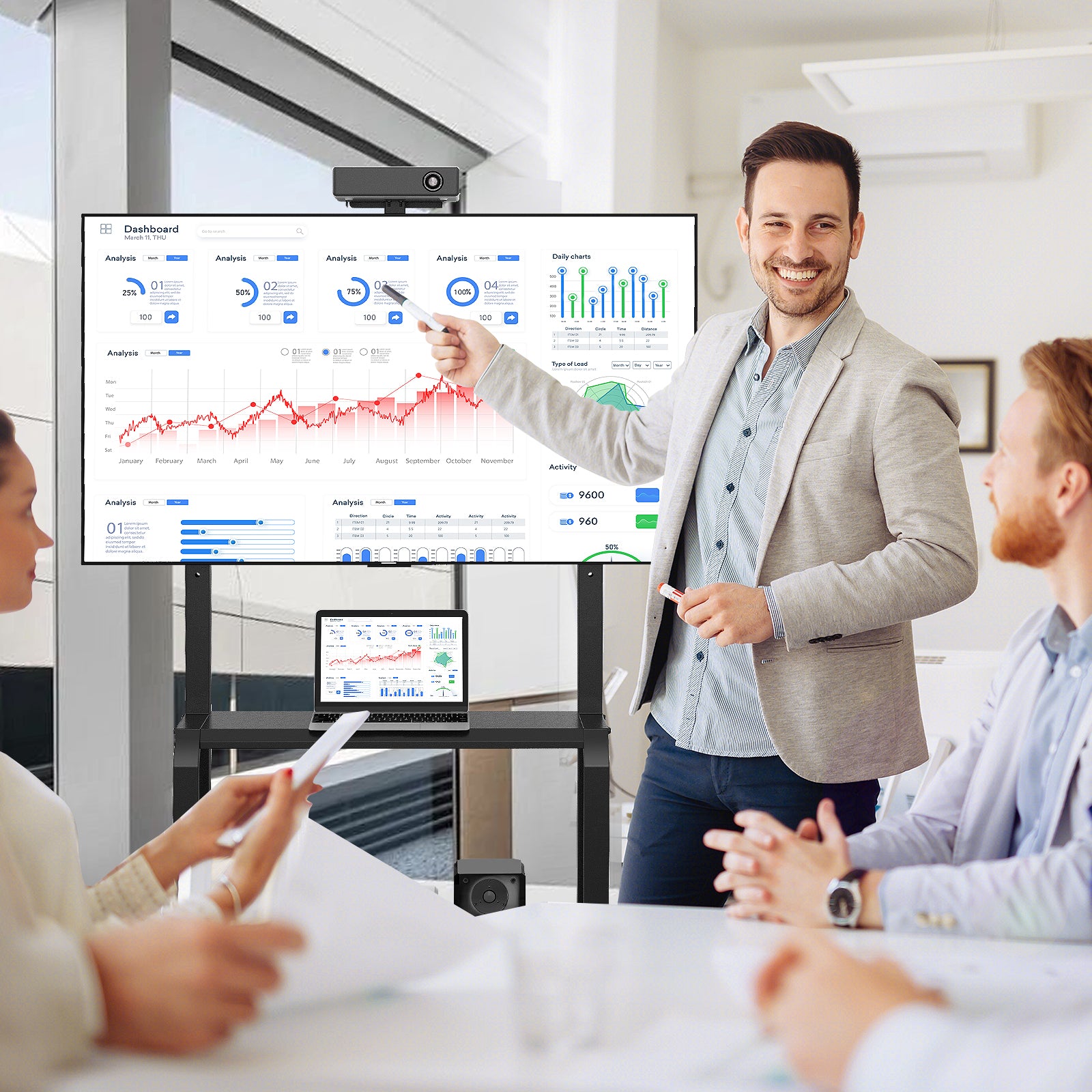 Enhanced Storage Solutions: This mobile stand includes a 2-tier AV shelf for storing items like laptops, WiFi routers, and audio speakers. A camera shelf with 16 adjustable positions further enhances its functionality, providing space for video conferencing or recording equipment.