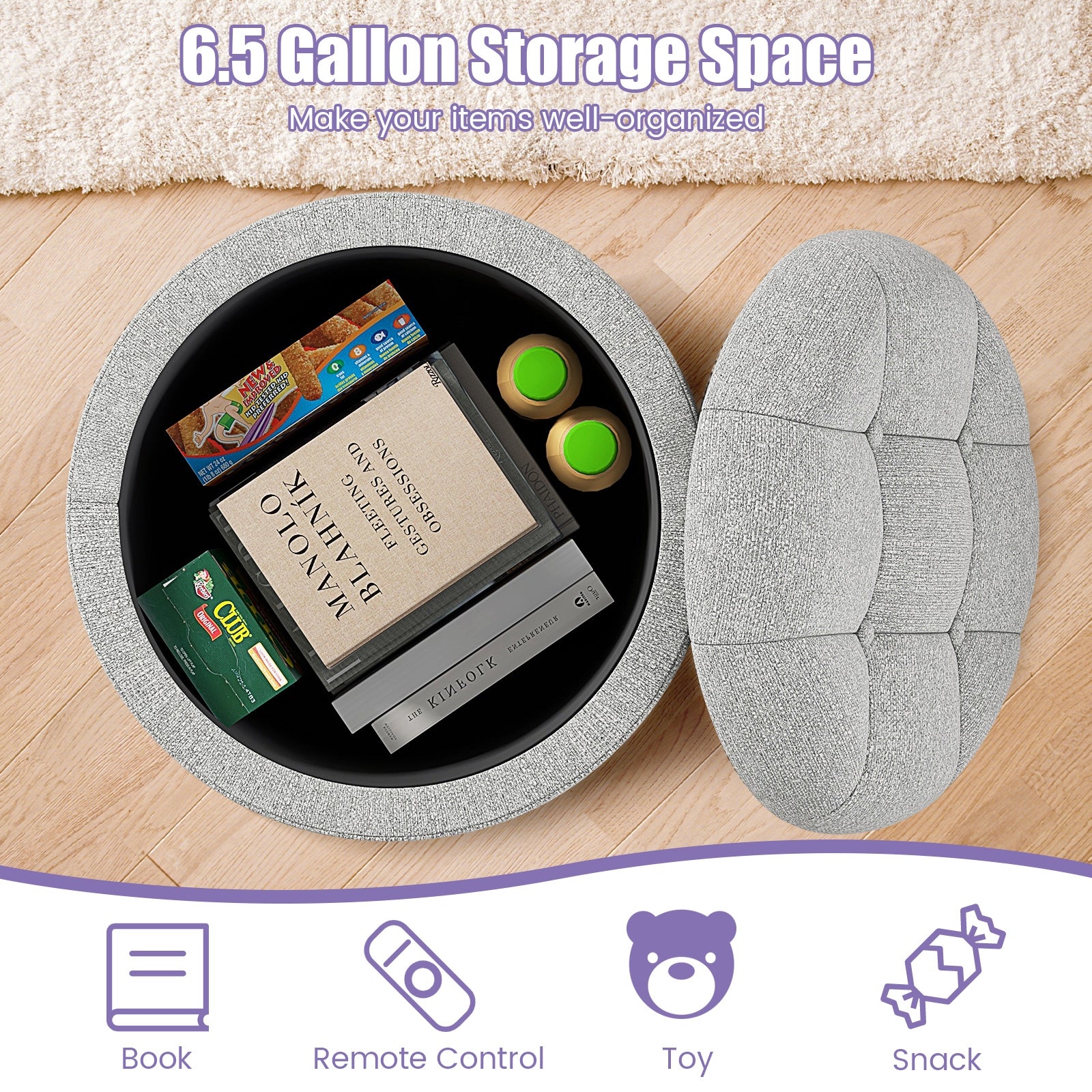 Round Upholstered Storage Ottoman with Tufted Seat and Solid Rubber Wood Legs