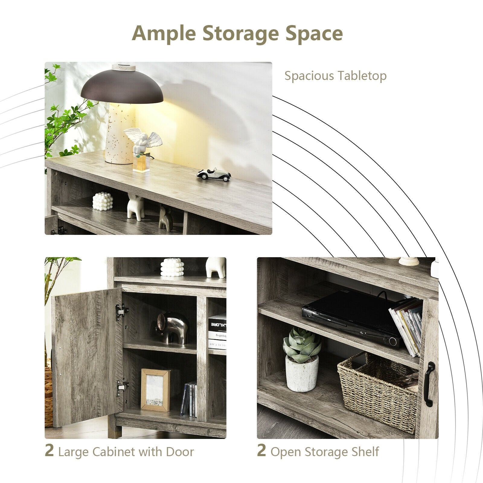 Spacious and Versatile Storage: Designed with a wide tabletop for TVs up to 65 inches, this stand includes four open compartments and two cabinets, offering generous space for media equipment, décor, books, or everyday essentials.