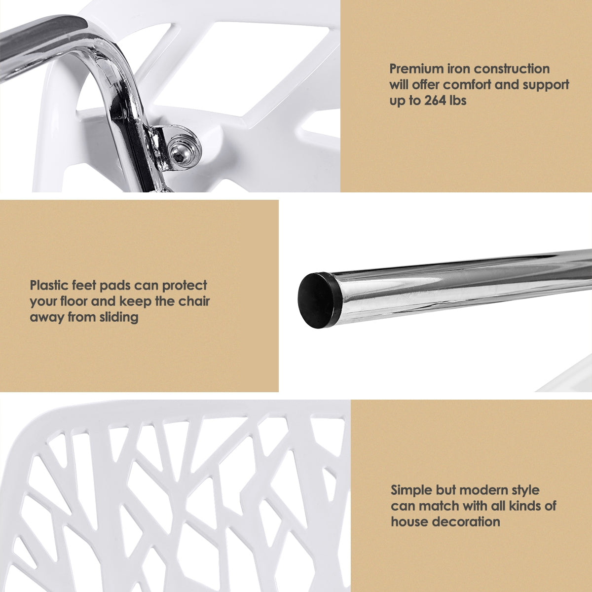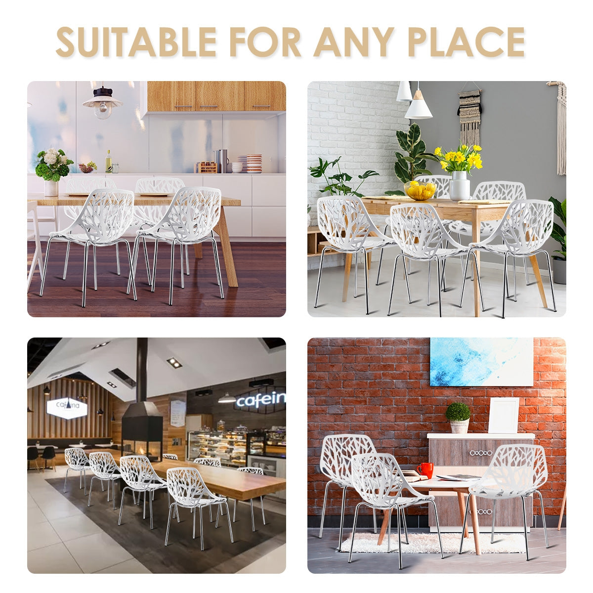 Add a modern touch to your indoor or outdoor space with this set of 6 stylish dining chairs. Featuring a contemporary cut-out tree design, these chairs are constructed from premium iron for long-lasting durability and strength. The stackable design allows for easy storage, while the plastic feet ensure your floors remain scratch-free. Ideal for a dining room, patio, or backyard, these chairs combine both aesthetics and practicality for an elegant seating solution.