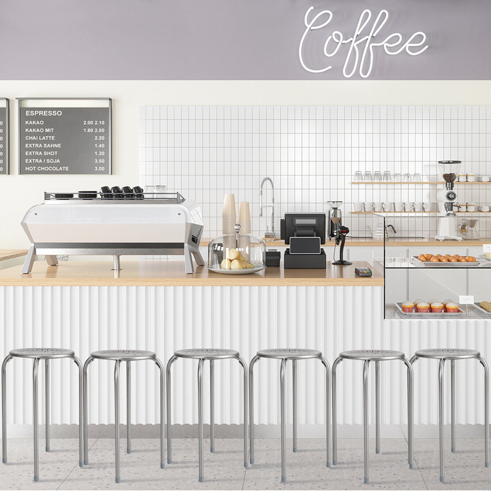 This set of 6 stylish metal stools is designed for both indoor and outdoor use. With a unique daisy pattern cut and a durable powder-coated finish, these stools add a touch of charm to any setting. They feature non-marking foot caps to protect your floor, are stackable for efficient storage, and have a strong weight capacity of up to 250 lbs. Perfect for family gatherings, parties, or events, these stools are practical, space-saving, and easy to clean, ensuring long-lasting enjoyment for any occasion.