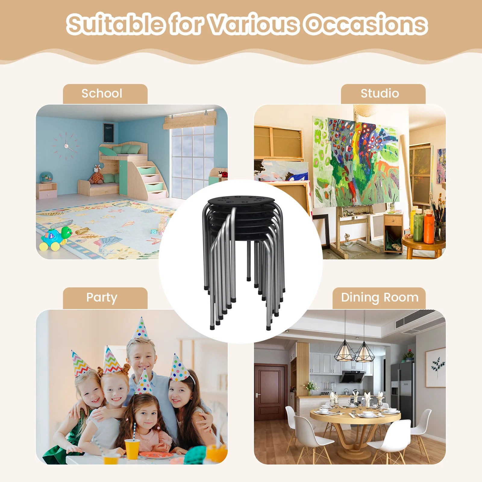 The Set of 6 Metal Stools is a versatile and durable seating solution designed to enhance any space. Made with a sturdy steel frame and durable PP seats, these stools offer excellent rust resistance, stability, and comfort. Their stackable design makes them easy to store, while the ergonomic 17.5" seat height suits most standard tables. Ideal for home, office, dorms, classrooms, or parties, these stools are both practical and stylish. Antiskid foot caps protect your floors, and no assembly is required for quick setup.