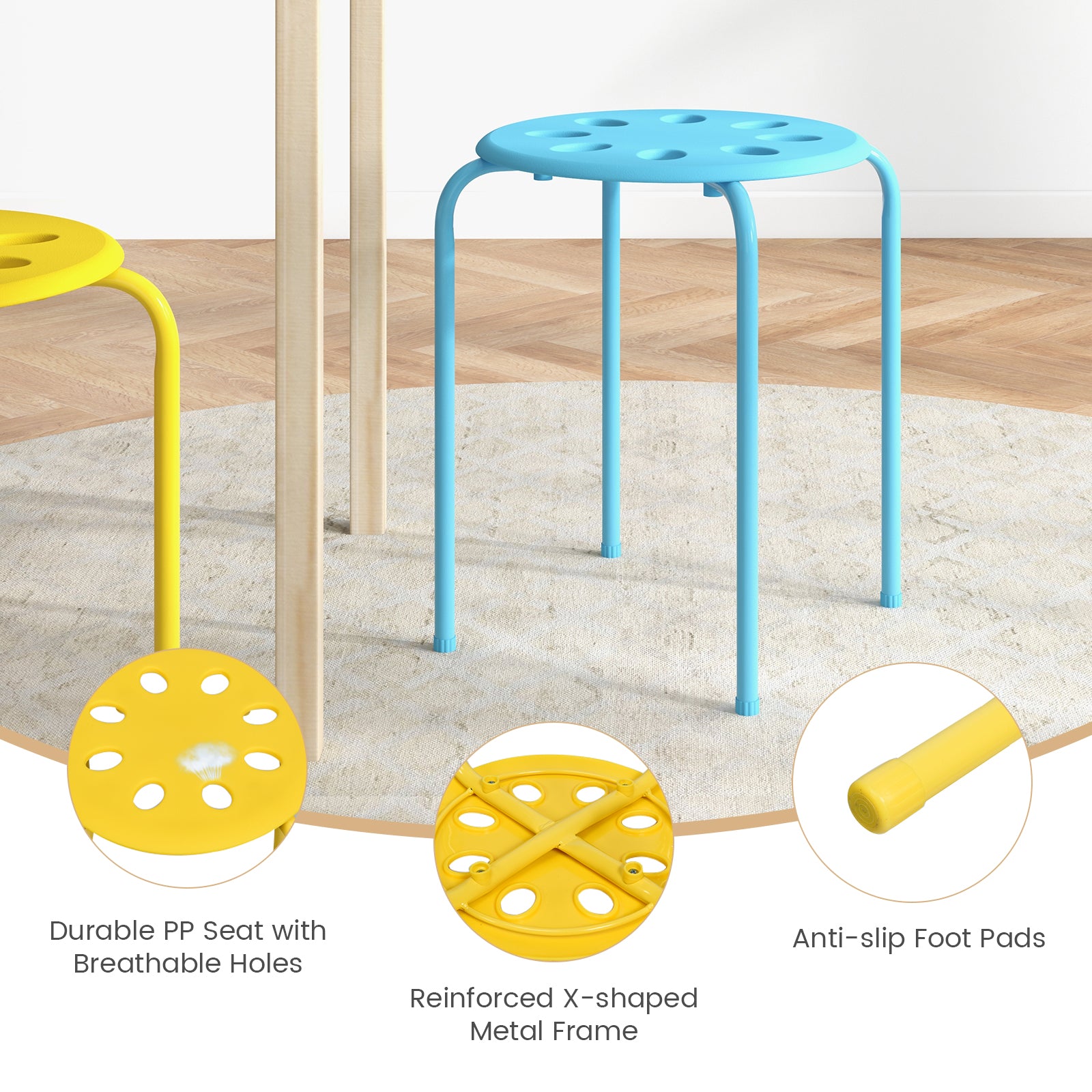 The Set of 6 Metal Stools is a versatile and durable seating solution designed to enhance any space. Made with a sturdy steel frame and durable PP seats, these stools offer excellent rust resistance, stability, and comfort. Their stackable design makes them easy to store, while the ergonomic 17.5" seat height suits most standard tables. Ideal for home, office, dorms, classrooms, or parties, these stools are both practical and stylish. Antiskid foot caps protect your floors, and no assembly is required for quick setup.