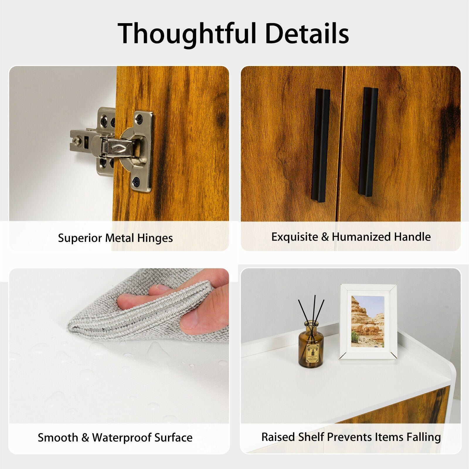 This modern 2-door floor storage cabinet blends elegance and functionality, making it a perfect fit for any bedroom, living room, dining room, or entryway. Featuring a rustic brown wood grain finish and smooth edges, it adds a touch of retro charm to your interior while offering practical storage. The spacious tabletop holds everyday essentials, and the cabinet with an internal partition keeps items organized. Built with durable MDF and supported by powder coated metal legs, it ensures long-lasting stability. Designed with anti-slip foot pads, premium hinges, and raised shelf edges, this cabinet is user-friendly, stylish, and easy to maintain.