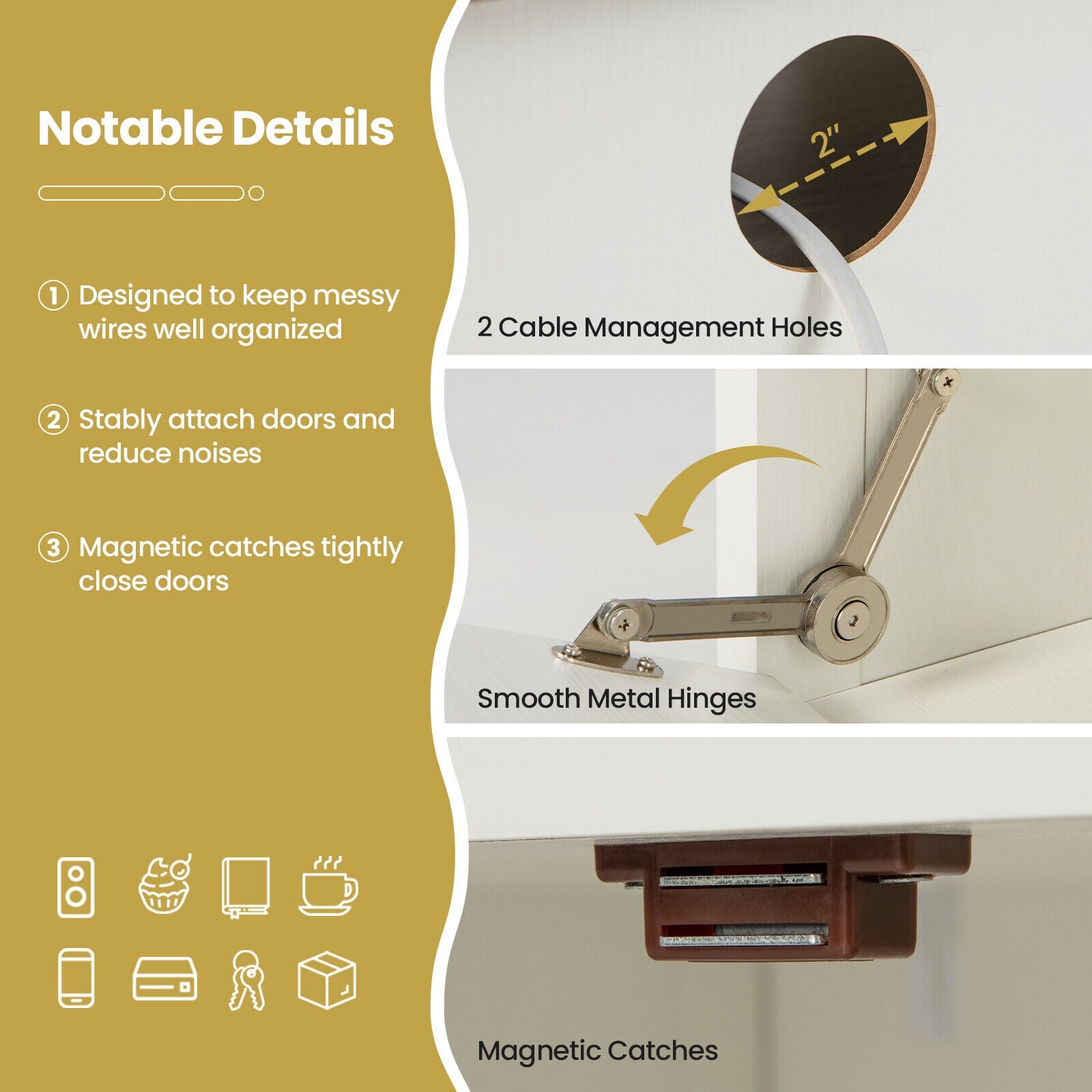 Ample Independent Storage: In addition to the tabletop, the stand includes two open shelves suitable for DVDs, magazines, or consoles, and two enclosed cabinets for more private storage. The cabinet doors are equipped with durable metal hinges for smooth operation and magnetic catches to ensure they close securely.