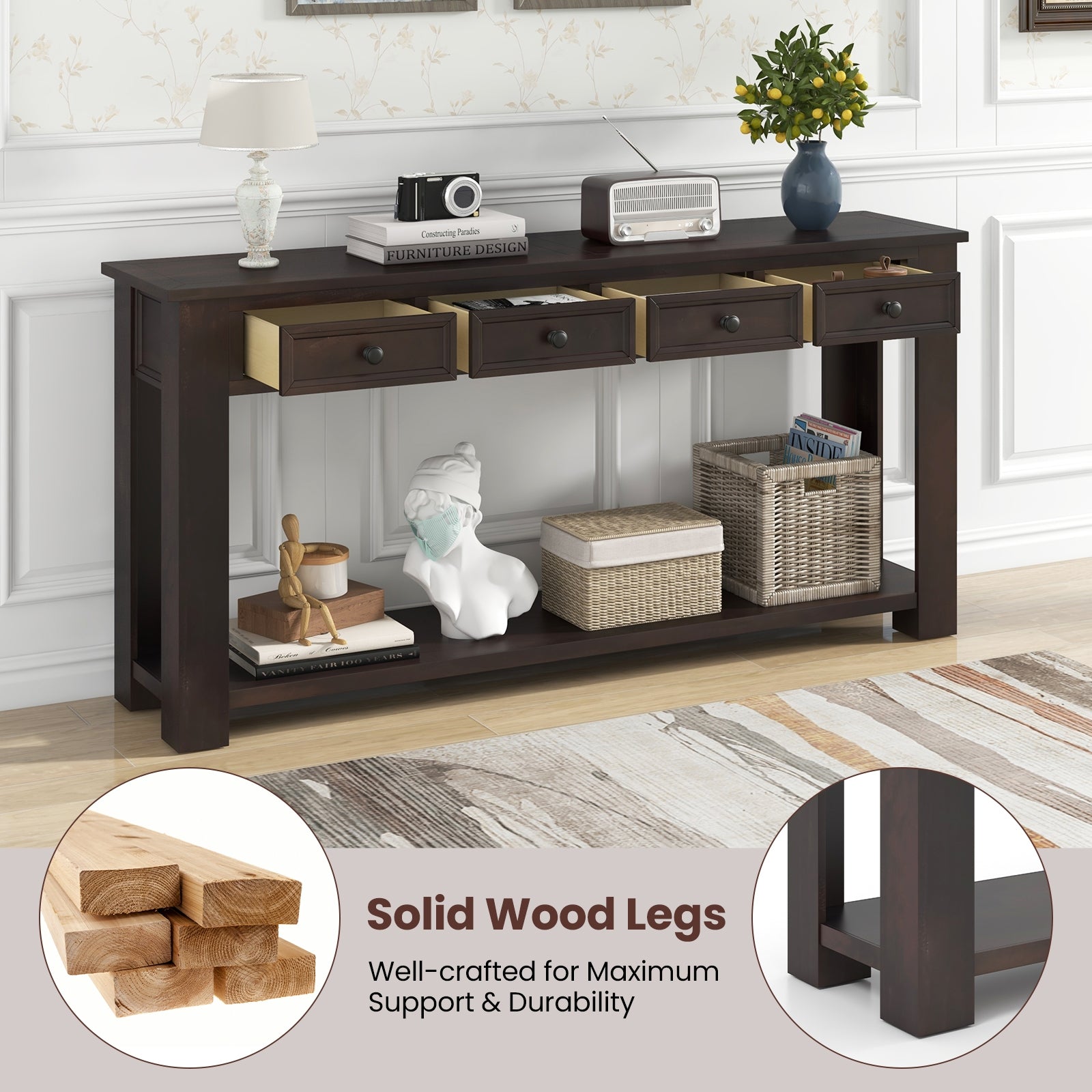 Spacious 63" Farmhouse Entryway Table with 4 Drawers and Open Shelf Storage