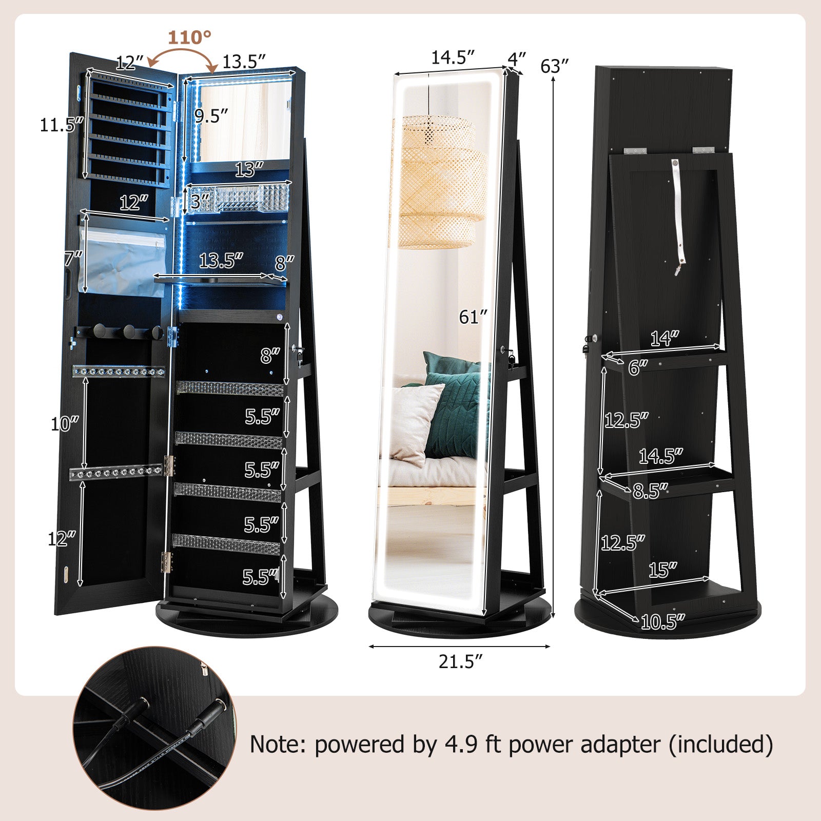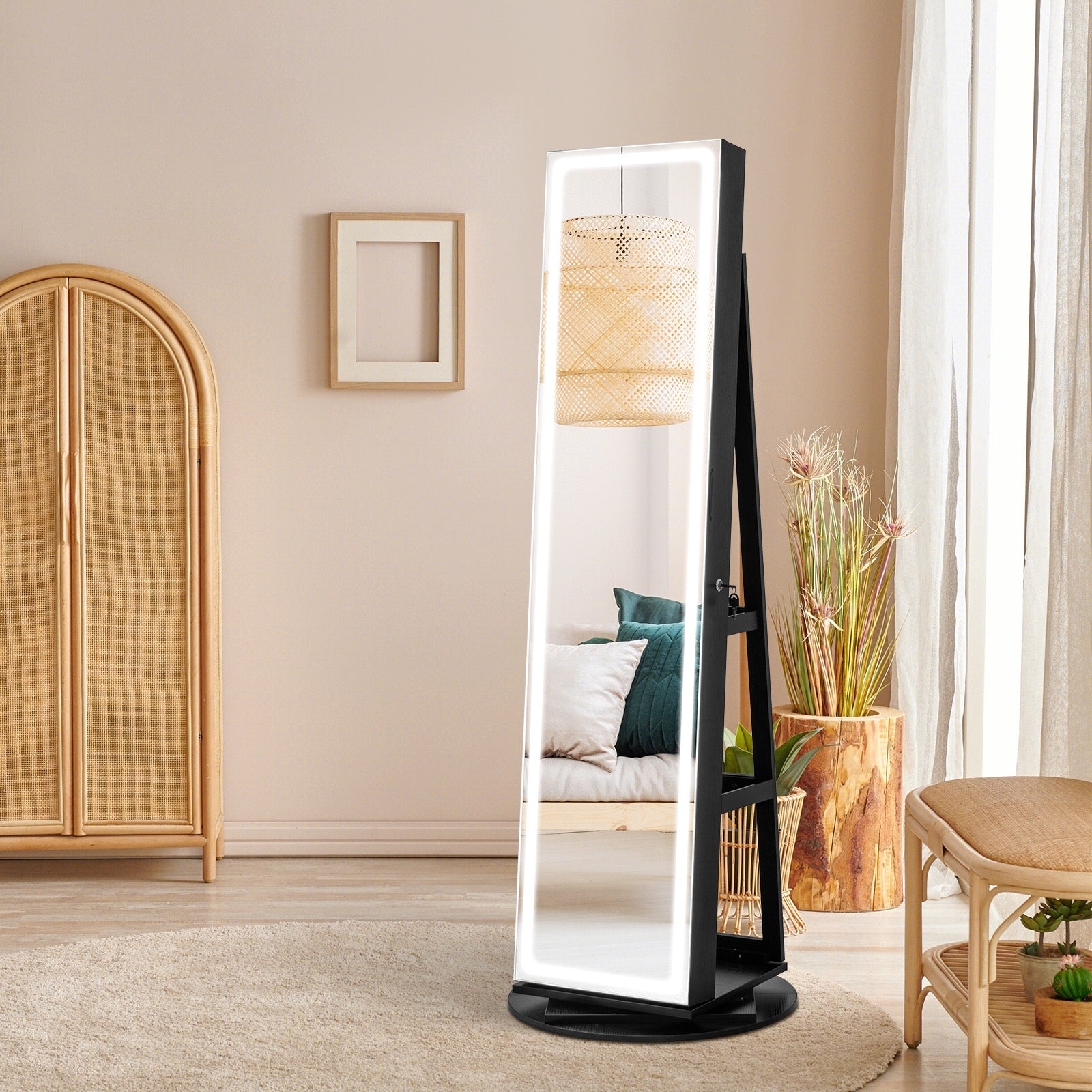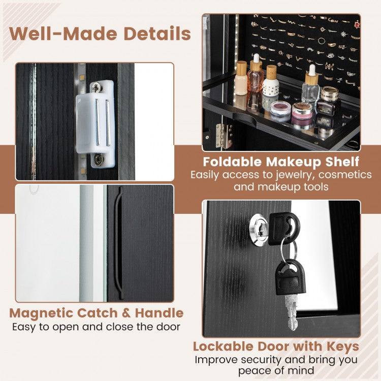Maximize style, storage, and functionality with this 4-in-1 standing jewelry cabinet. Combining a full-length LED mirror, a foldable vanity table, a lighted makeup mirror, and ample jewelry storage, it transforms your daily routine into a seamless experience. With a rotating base for all-around access and durable construction, it’s designed to keep your essentials secure, organized, and beautifully displayed for years to come.