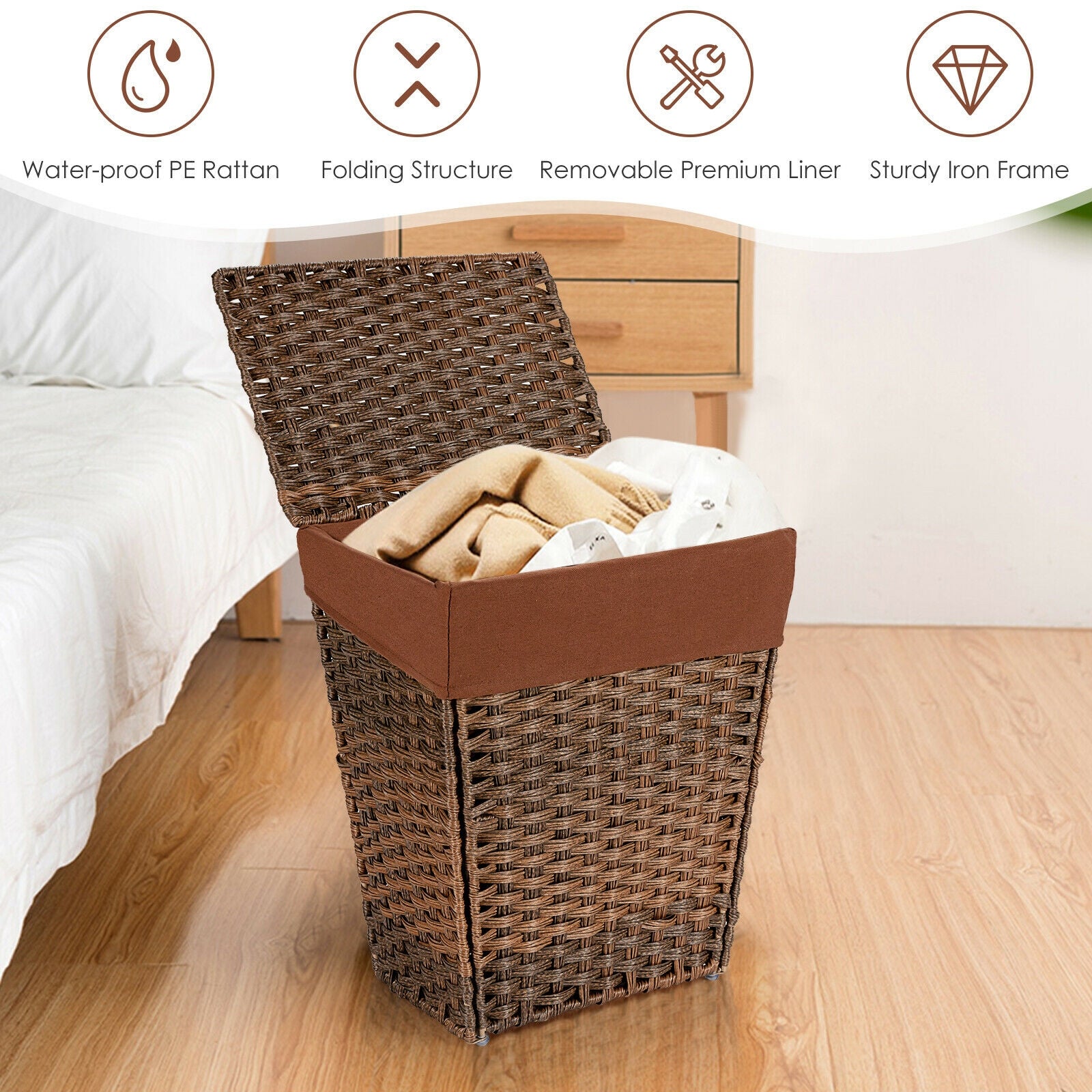 Handwoven PE Rattan Material: The hamper is crafted from high-quality synthetic PE rattan, meticulously handwoven to create a charming and unique design that complements any room decor.