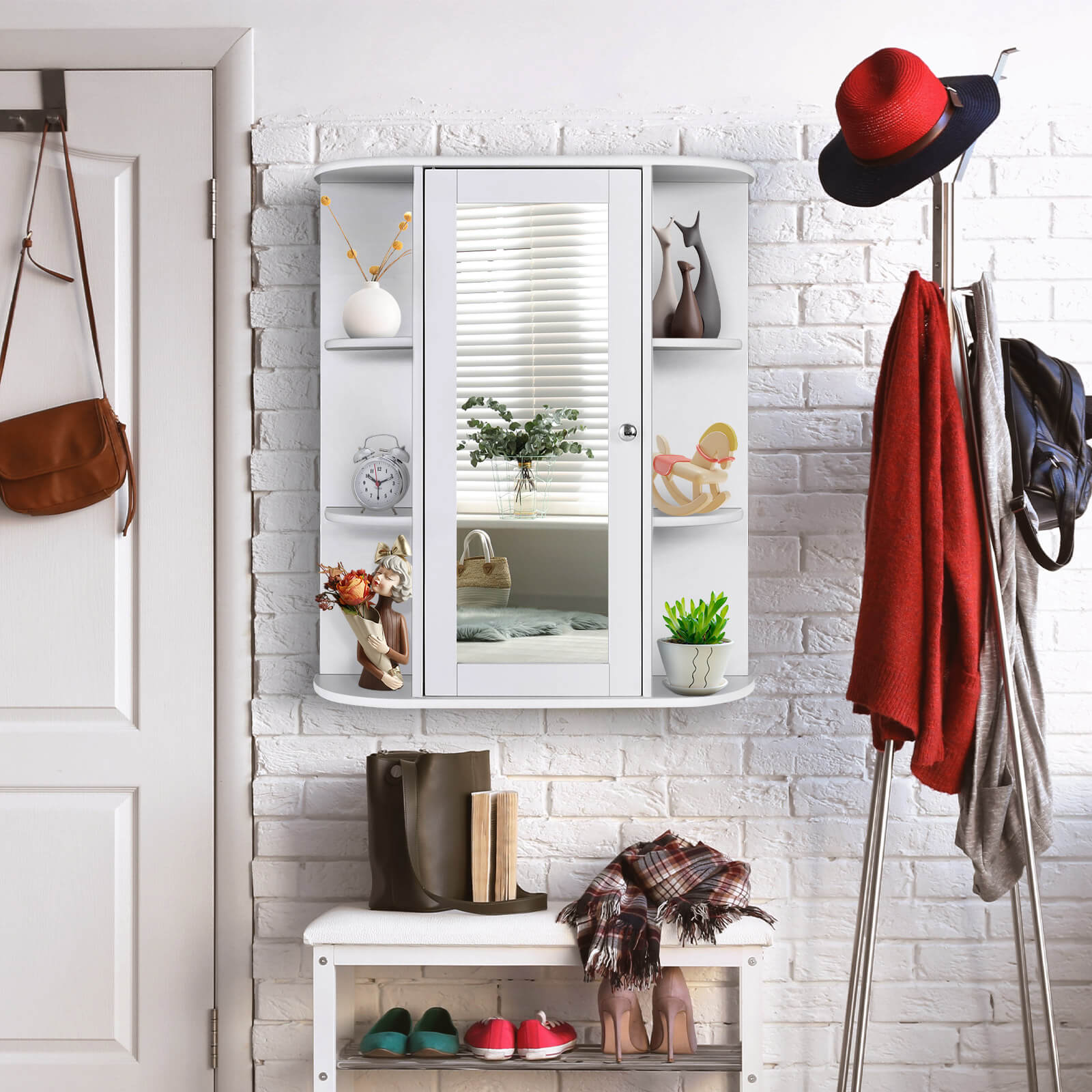 This sleek and modern wood bathroom cabinet provides ample storage space while keeping your bathroom, kitchen, or bedroom organized. Featuring six open shelves and an enclosed adjustable shelf with a mirror door, this cabinet offers both functionality and style. Crafted from premium white-painted MDF, it ensures durability and ease of maintenance. The convenient wall-mounted design saves valuable floor space, making it an ideal choice for small spaces. The adjustable inner shelves allow you to customize the storage for various items, while the mirror door adds an elegant touch. Whether for toiletries, towels, or decorative items, this cabinet provides an efficient and modern storage solution.