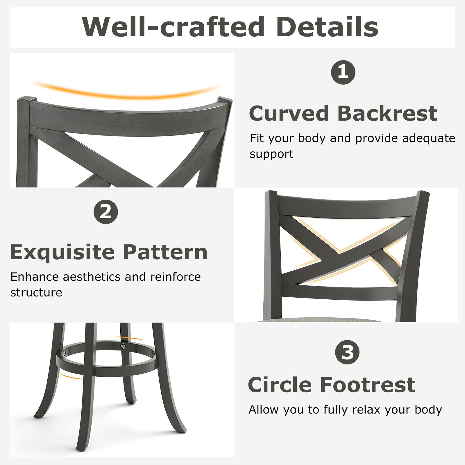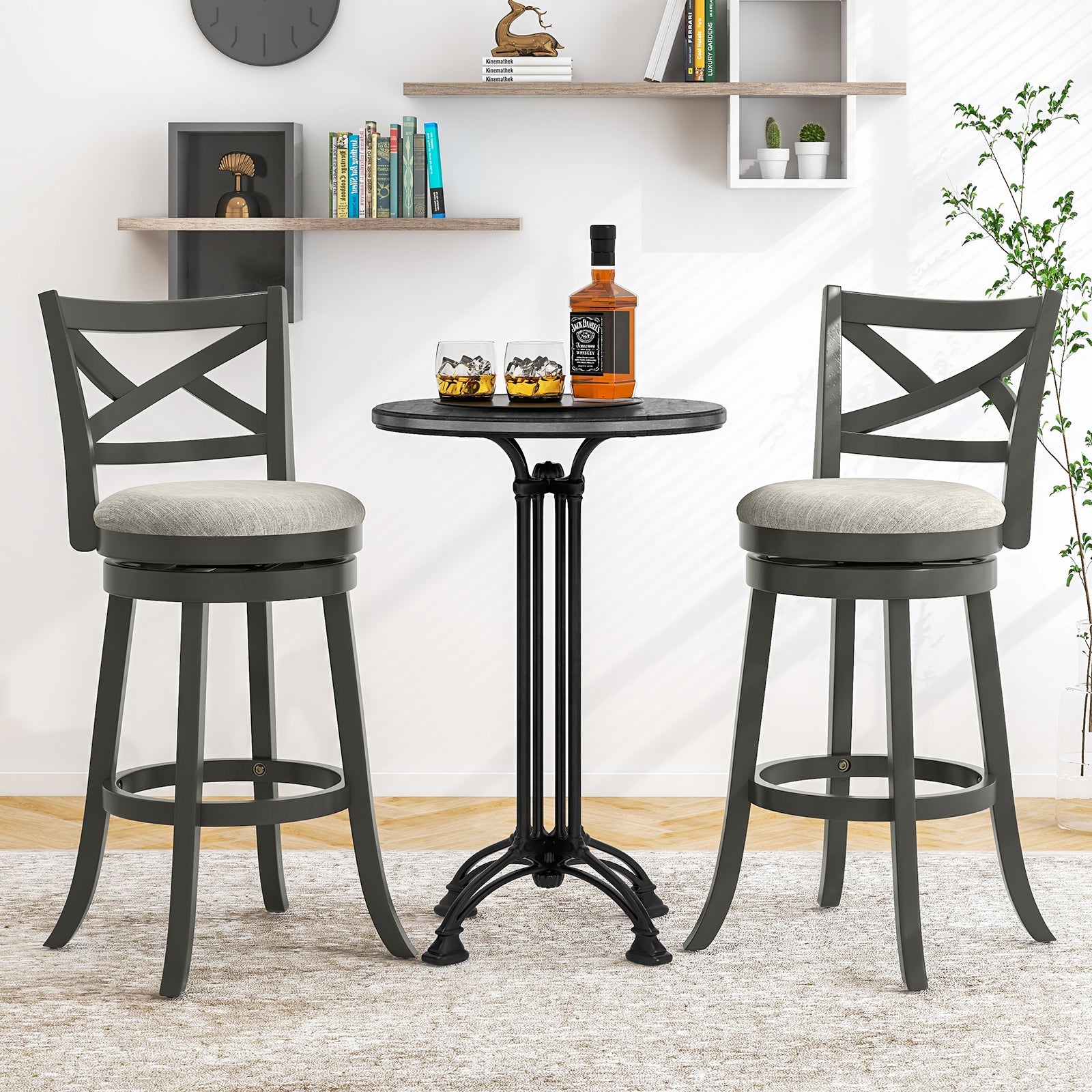 Experience comfort and style with this set of 2 swivel bar stools featuring a 360° swivel seat for easy movement and interaction. The curved hollow backrest offers ergonomic support while adding an elegant patterned design that enhances both aesthetics and structure. Upholstered in breathable linen fabric and padded with high-density sponge, these stools provide lasting comfort for long hours of sitting. A sturdy wood frame and integrated footrest ensure stability and relaxation, making them ideal for kitchens, bars, and dining areas.