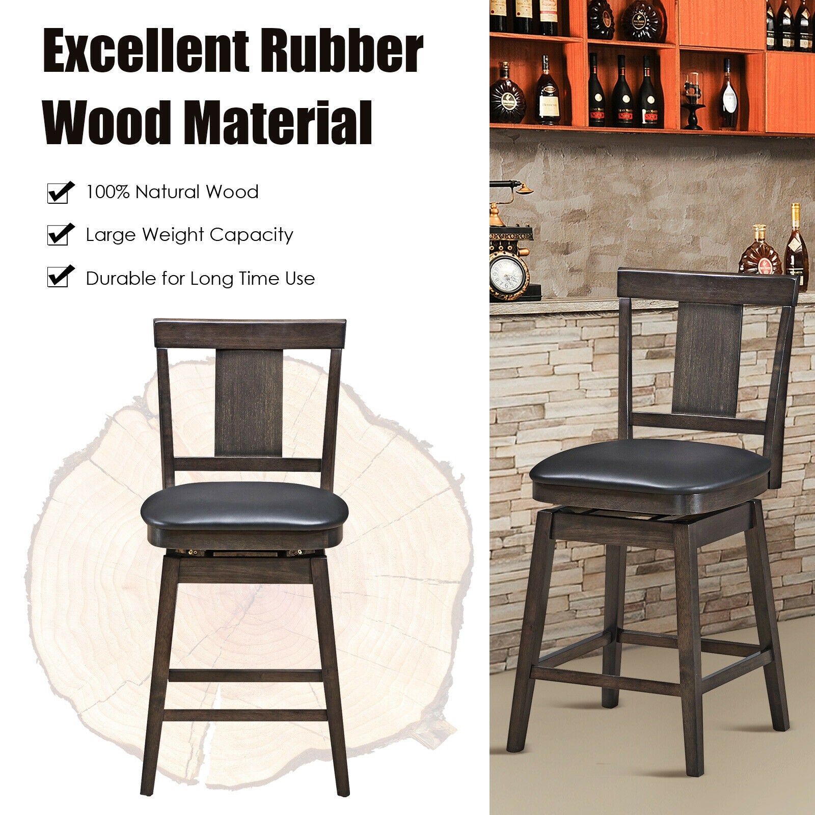 Enjoy a blend of comfort, functionality, and timeless style with this swivel bar stool, thoughtfully designed to enhance your home or commercial space. Featuring an ergonomically contoured backrest, padded PVC leather seat, and convenient footrest, it provides excellent support for daily use. The 360-degree swivel design allows for smooth and flexible movement, while its solid rubber wood construction ensures reliable durability. Ideal for kitchens, counters, coffee shops, or pubs, this bar stool adds charm and comfort wherever it's placed.