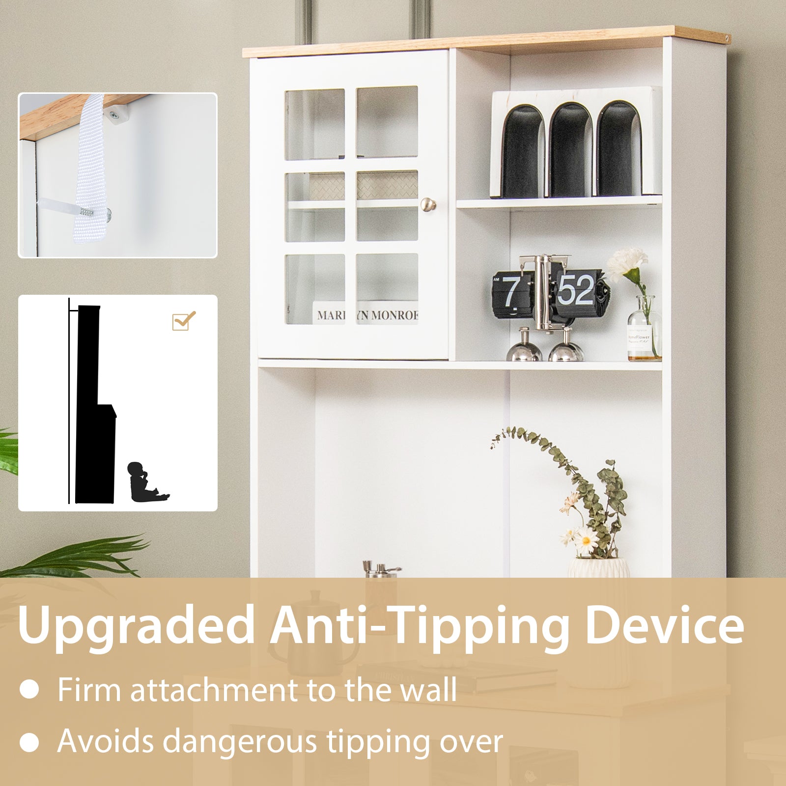 Enhanced Safety with Anti-Tipping Kit: Designed for family safety, the sideboard includes 2 anti-tipping kits that can be firmly secured to the wall. This prevents the cabinet from wobbling or tipping over. In addition, anti-slip pads at the base provide floor protection and reinforce the unit’s overall stability.