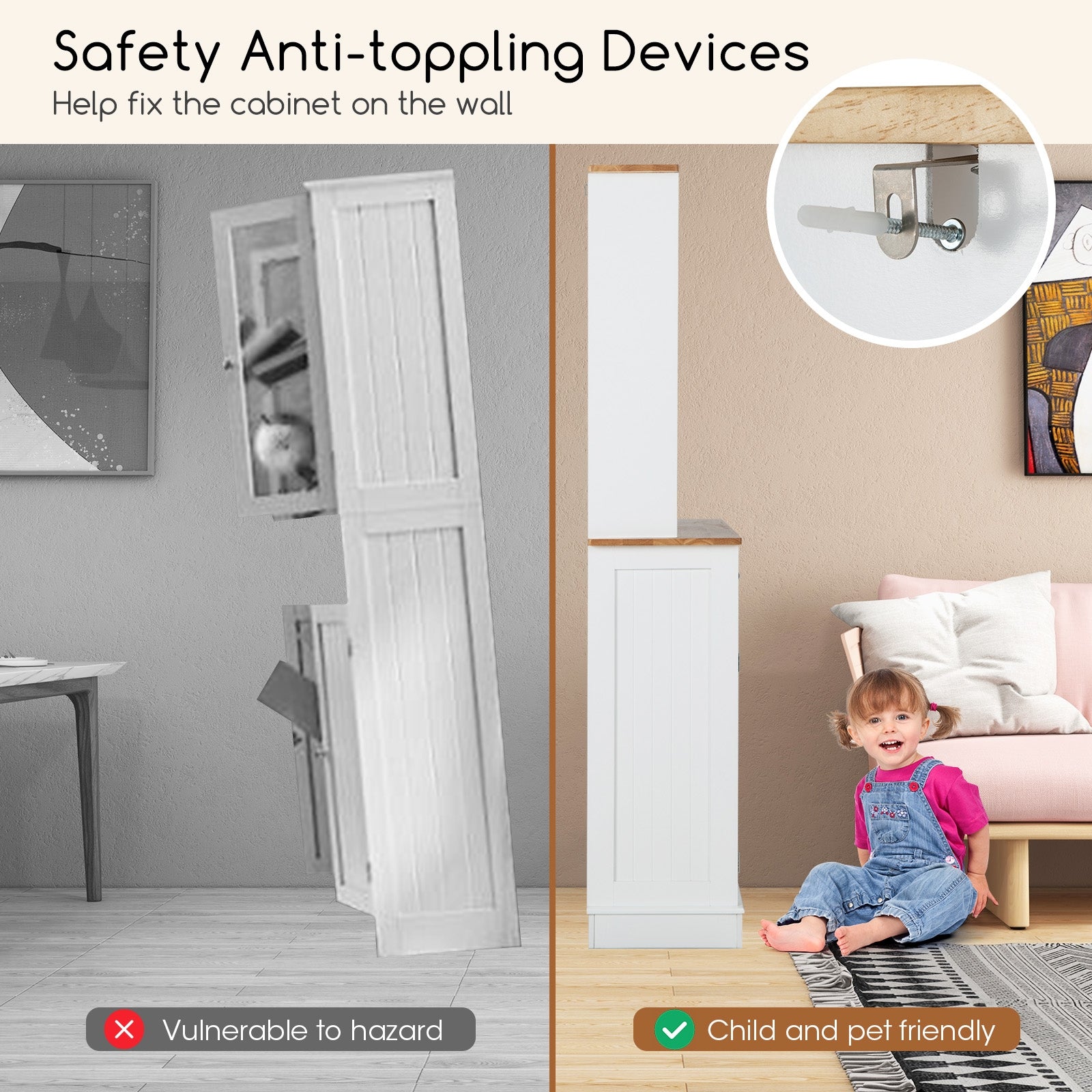 ● Reliable Materials and Construction: The cabinet is made from high quality boards to ensure a sturdy construction. The rubberwood countertop is hard-wearing and full of natural charm, making it suitable for long-term use. In addition, the cabinet has anti-toppling devices that can be secured to the wall for safety.