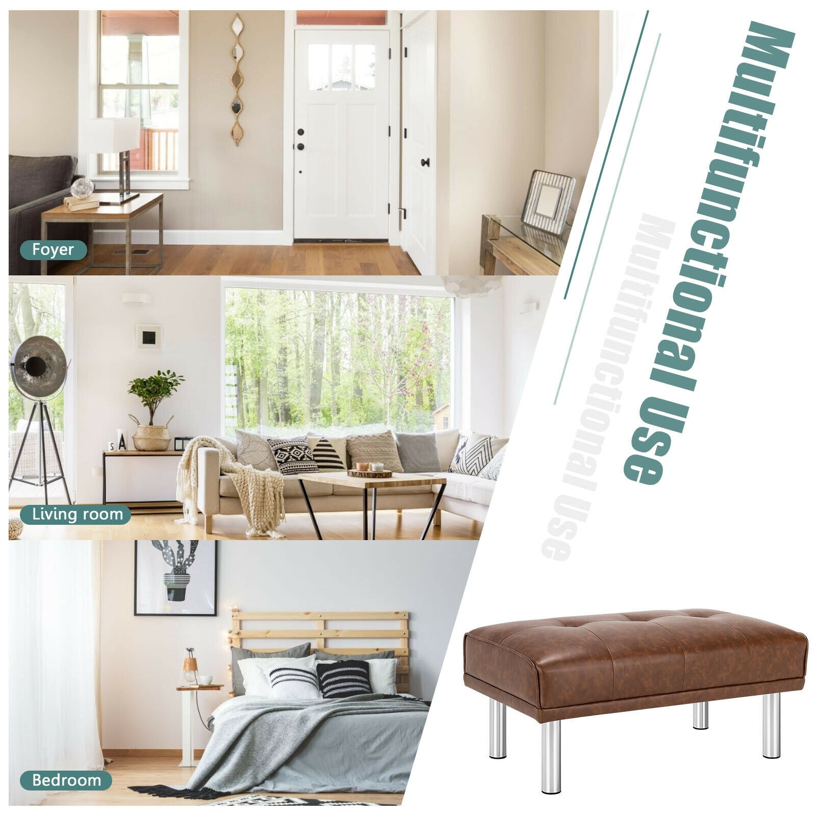 Tufted Faux Leather Bench Ottoman with Stainless Steel Legs and Padded Seat in Brown