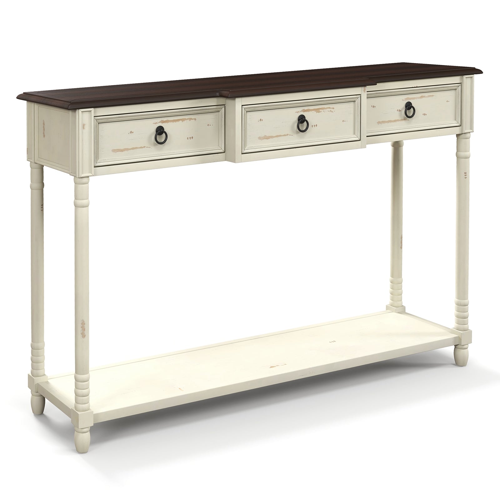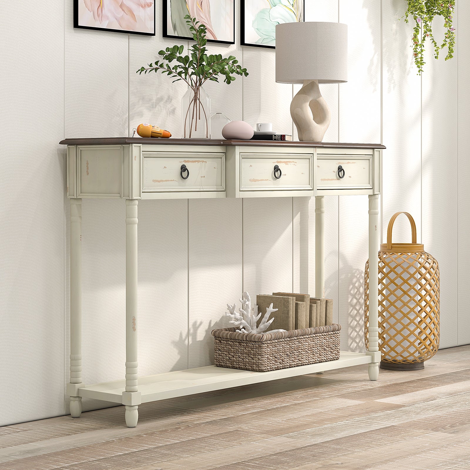 This 52 inch console table combines rustic cottage charm with functional storage, making it a timeless addition to your hallway, entryway, or living room. Crafted with solid wood legs and detailed carved feet, it features a spacious tabletop, three drawers, and a wide bottom shelf to organize and display your favorite items. The distressed off-white and brown finish enhances its vintage character, while thoughtful details like anti-tipping kits and non-slip foot pads ensure stability and safety in everyday use.