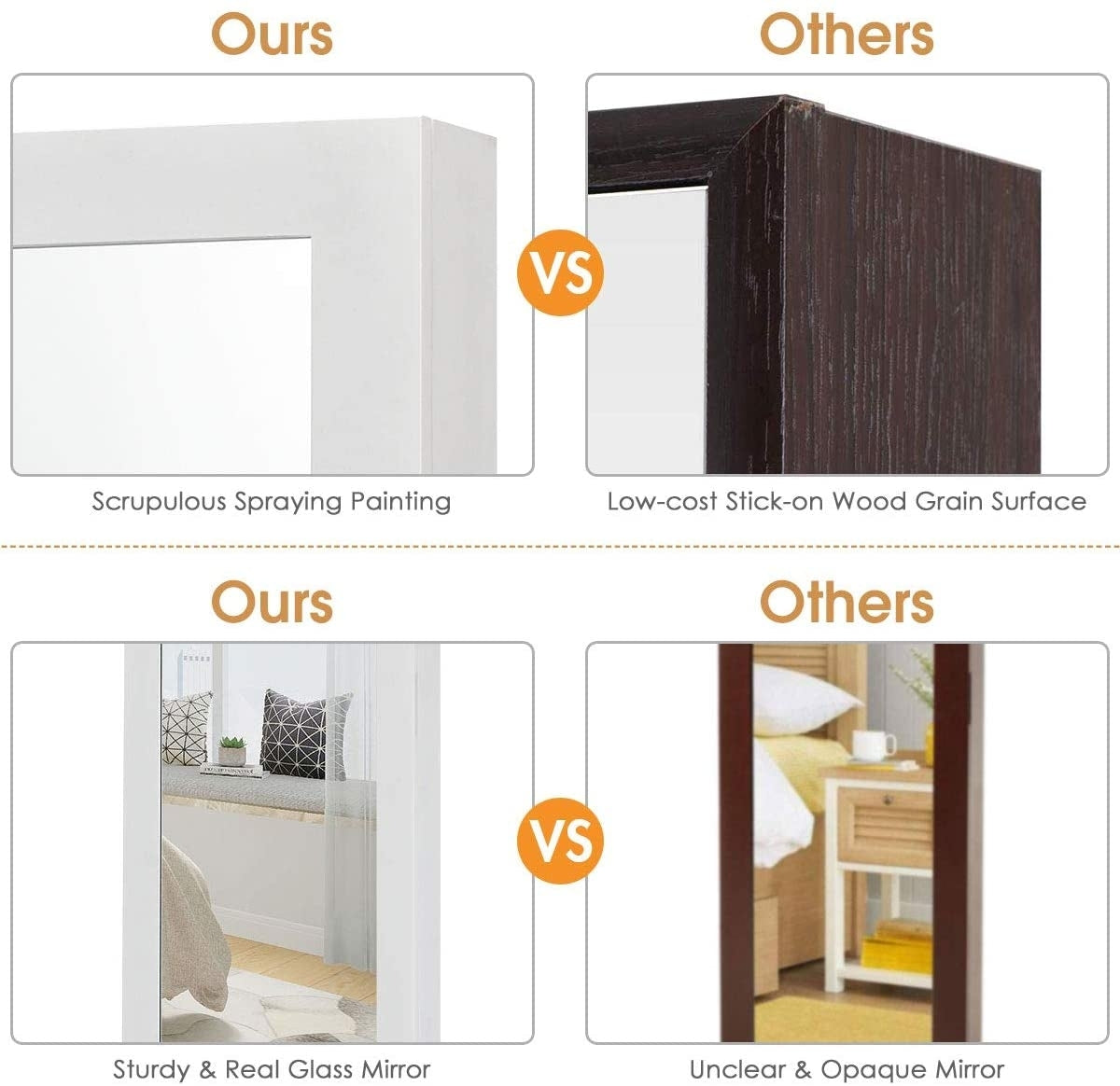 Wall & Door Mounted Full Length Mirror Jewelry Armoire with Ring Slots, Necklace Hooks and Storage Shelves – White