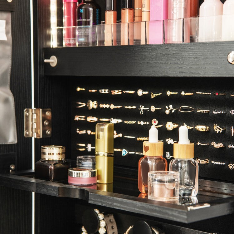 This elegant and practical 2-in-1 mirrored jewelry armoire is designed to add both beauty and function to your space. Featuring a full-length frameless mirror and abundant storage compartments, it keeps your jewelry and cosmetics organized while providing a clear reflection to check your outfit. The built-in small mirror with 3-color LED lights and a foldable shelf enhances convenience during makeup or jewelry selection. Whether wall-mounted or door-hung, this space-saving cabinet fits seamlessly into any bedroom, closet, or dressing area and includes a lock with 2 keys for added security.
