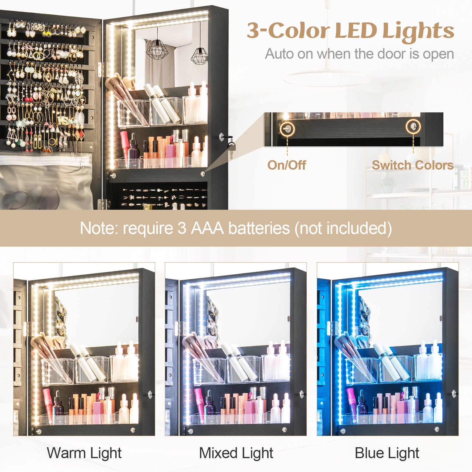 Bright LED Lights and Foldable Shelf: The built-in LED strip includes three color modes: blue light, warm yellow, and white light with blue. Lights automatically activate when the cabinet is opened and are powered by 3 AAA batteries (not included). A foldable acrylic shelf inside the cabinet offers a handy space to place cosmetics during makeup routines.