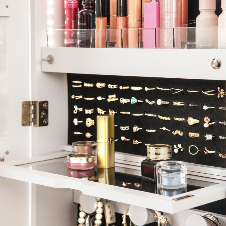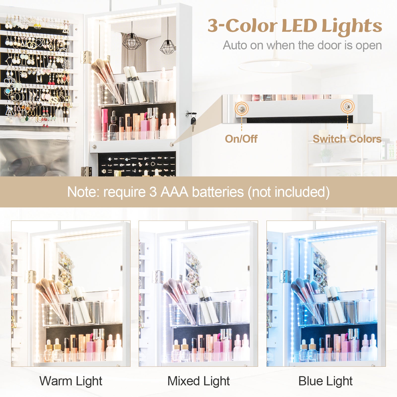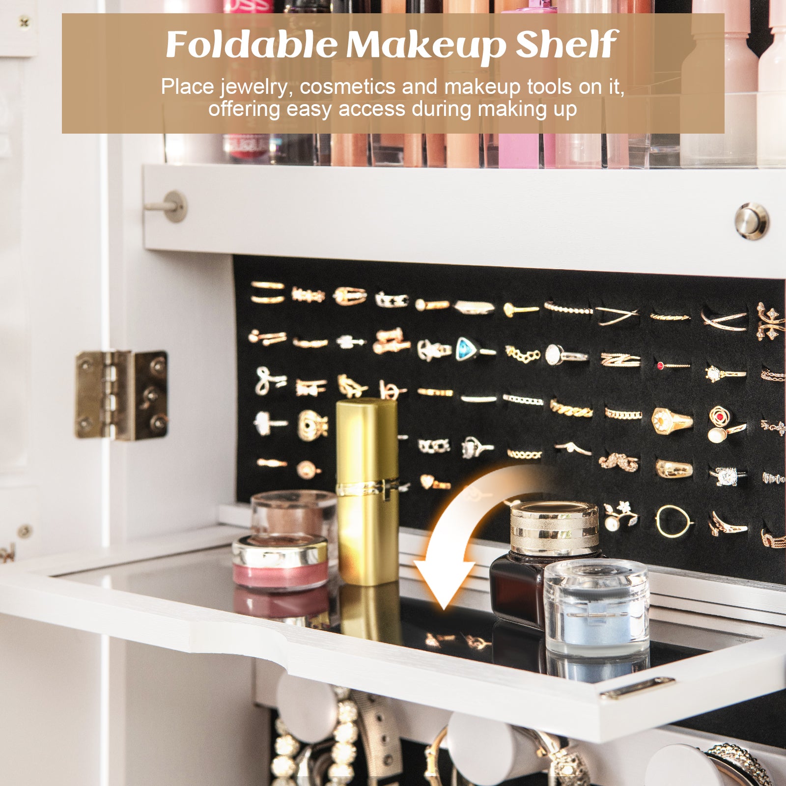 This elegant and practical 2-in-1 mirrored jewelry armoire is designed to add both beauty and function to your space. Featuring a full-length frameless mirror and abundant storage compartments, it keeps your jewelry and cosmetics organized while providing a clear reflection to check your outfit. The built-in small mirror with 3-color LED lights and a foldable shelf enhances convenience during makeup or jewelry selection. Whether wall-mounted or door-hung, this space-saving cabinet fits seamlessly into any bedroom, closet, or dressing area and includes a lock with 2 keys for added security.