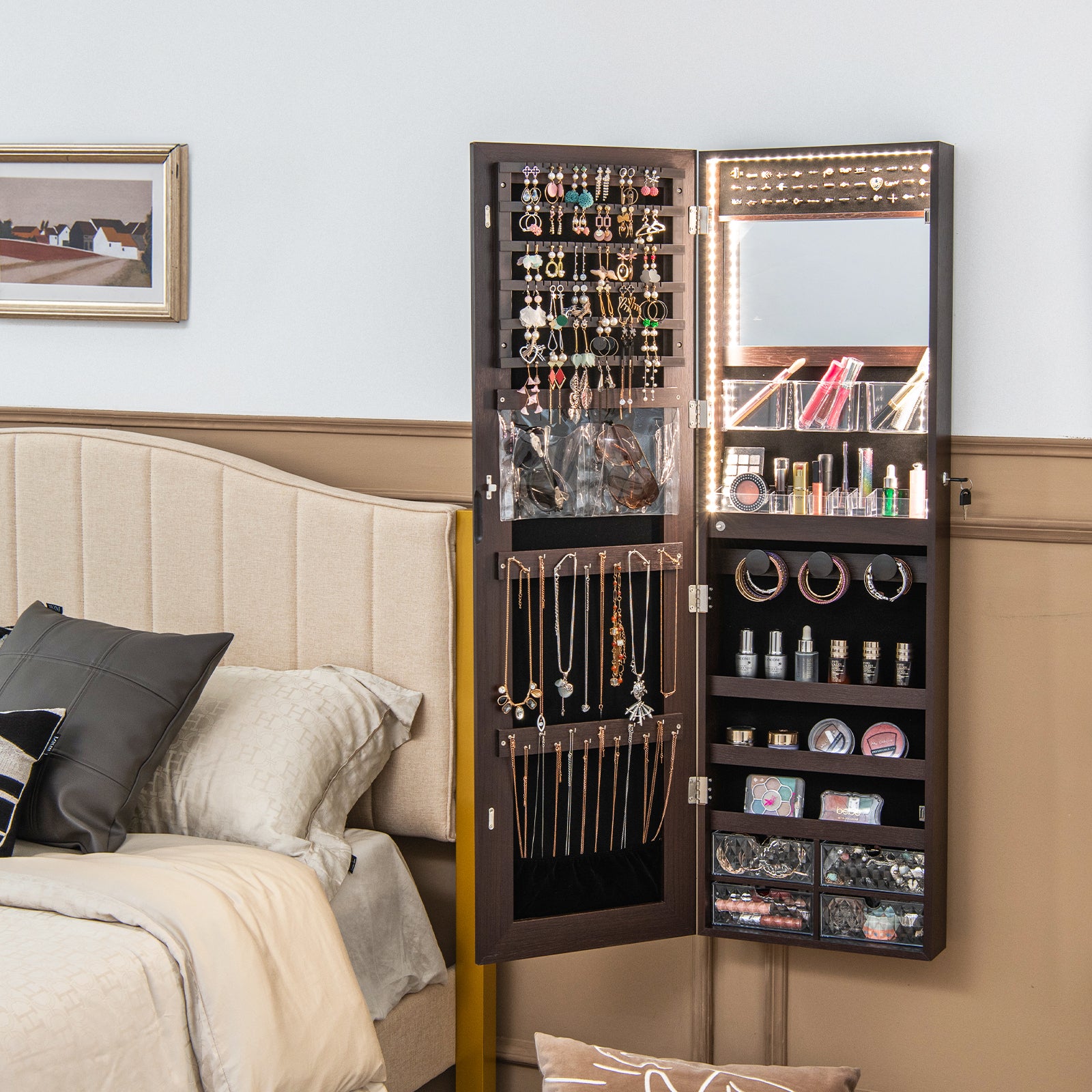 Wall Mounted Jewelry Armoire with Full-Length Mirror and 3-Color LED Lighting – Brown