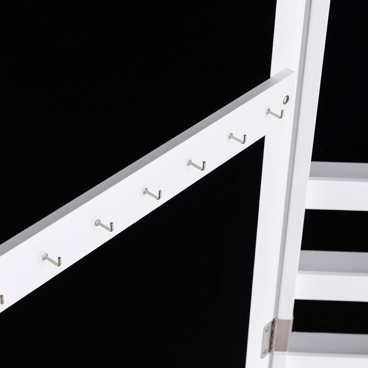This wall and door mounted jewelry cabinet with a full-length mirror and built-in lights is a perfect combination of function and style. Designed to keep your accessories organized, secure, and within easy reach, it features ample storage space for earrings, necklaces, rings, and more. The oxidation-resistant velvet lining protects your valuables from scratches, while the sturdy MDF frame ensures long-lasting durability. With its chic white finish and space-saving design, this elegant cabinet blends seamlessly with any bedroom décor.