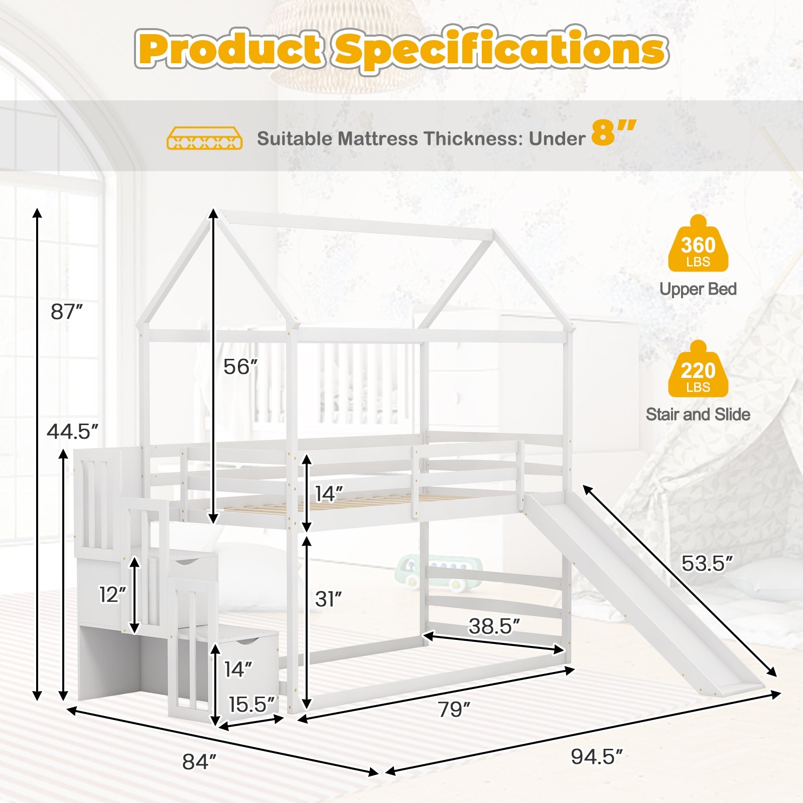 Whimsical Twin Loft Bed with Roof, Slide, and Storage Staircase for Kids - White