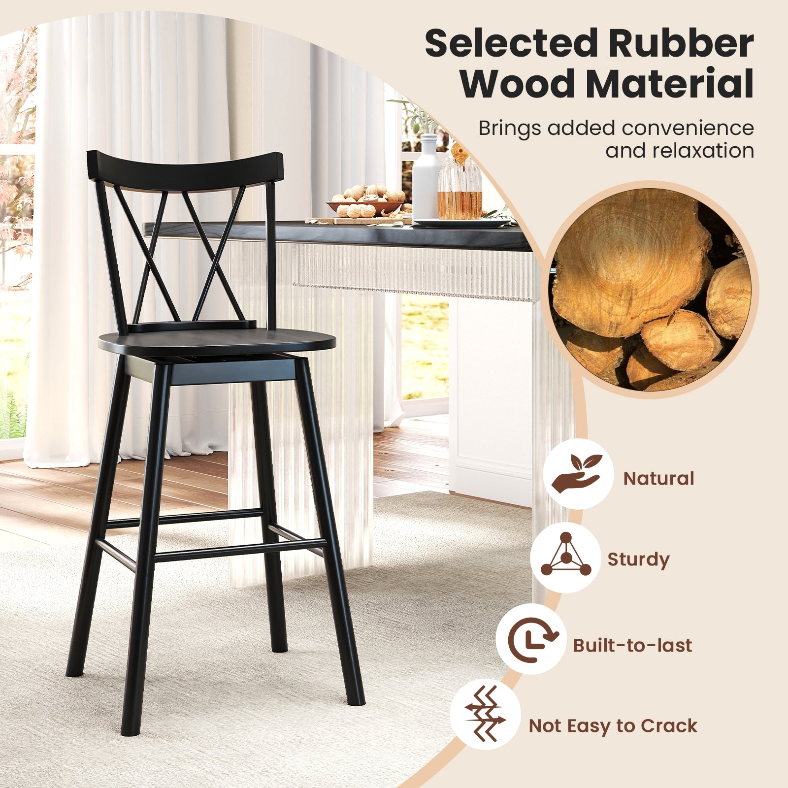 Durable Rubber Wood Frame: Crafted from natural rubber wood, these stools resist cracking and deforming over time. The solid wooden legs and frame offer long-lasting stability and a weight capacity of up to 290 lbs per chair.