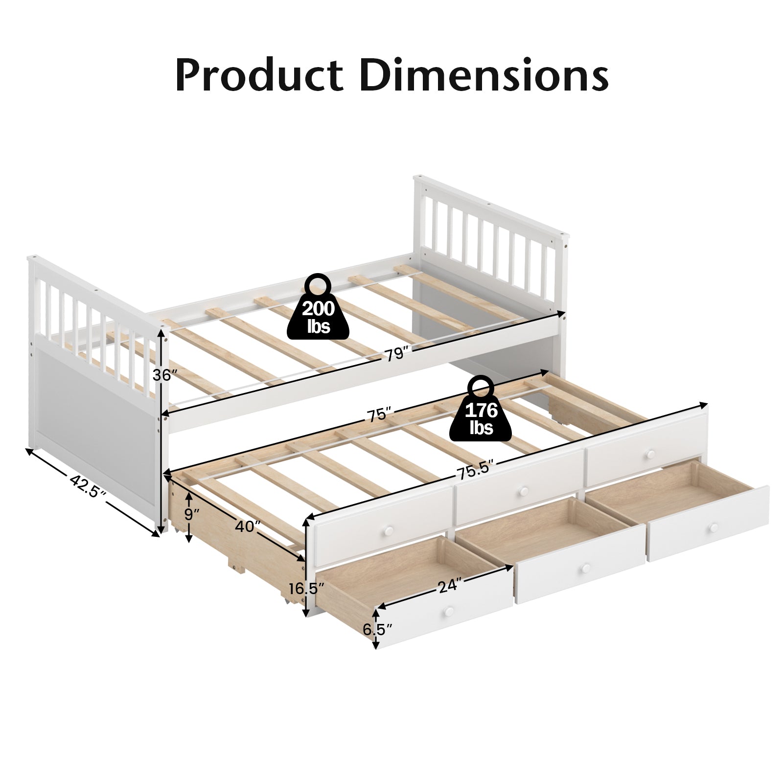 This twin size captain’s bed is a space-saving and stylish solution for families or guest rooms. Crafted from solid pine wood, the frame offers long-lasting stability and durability. It features a pull-out trundle bed to provide extra sleeping space and three built-in drawers for convenient storage. The bed’s classic design, complete with headboard and footboard, blends seamlessly with various décor styles. With smooth-rolling casters for easy access and detailed instructions for quick assembly, this multifunctional bed is both practical and elegant.