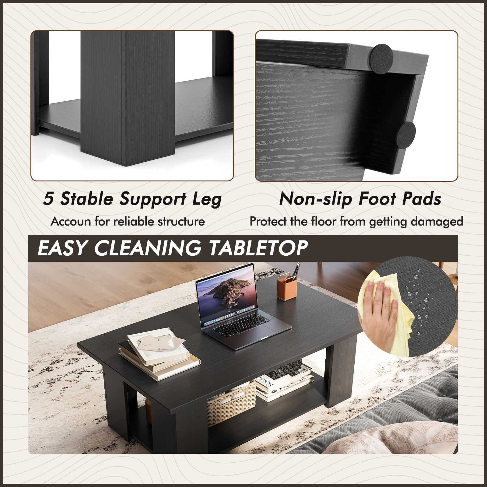 Quality Materials and Stable Construction: Crafted from premium engineered wood panels, this coffee table offers solid structural integrity and impressive weight-bearing capacity. The tabletop supports up to 210 lbs, and the lower shelf holds up to 66 lbs. The waterproof surface resists daily spills and can be easily wiped clean with a damp cloth.