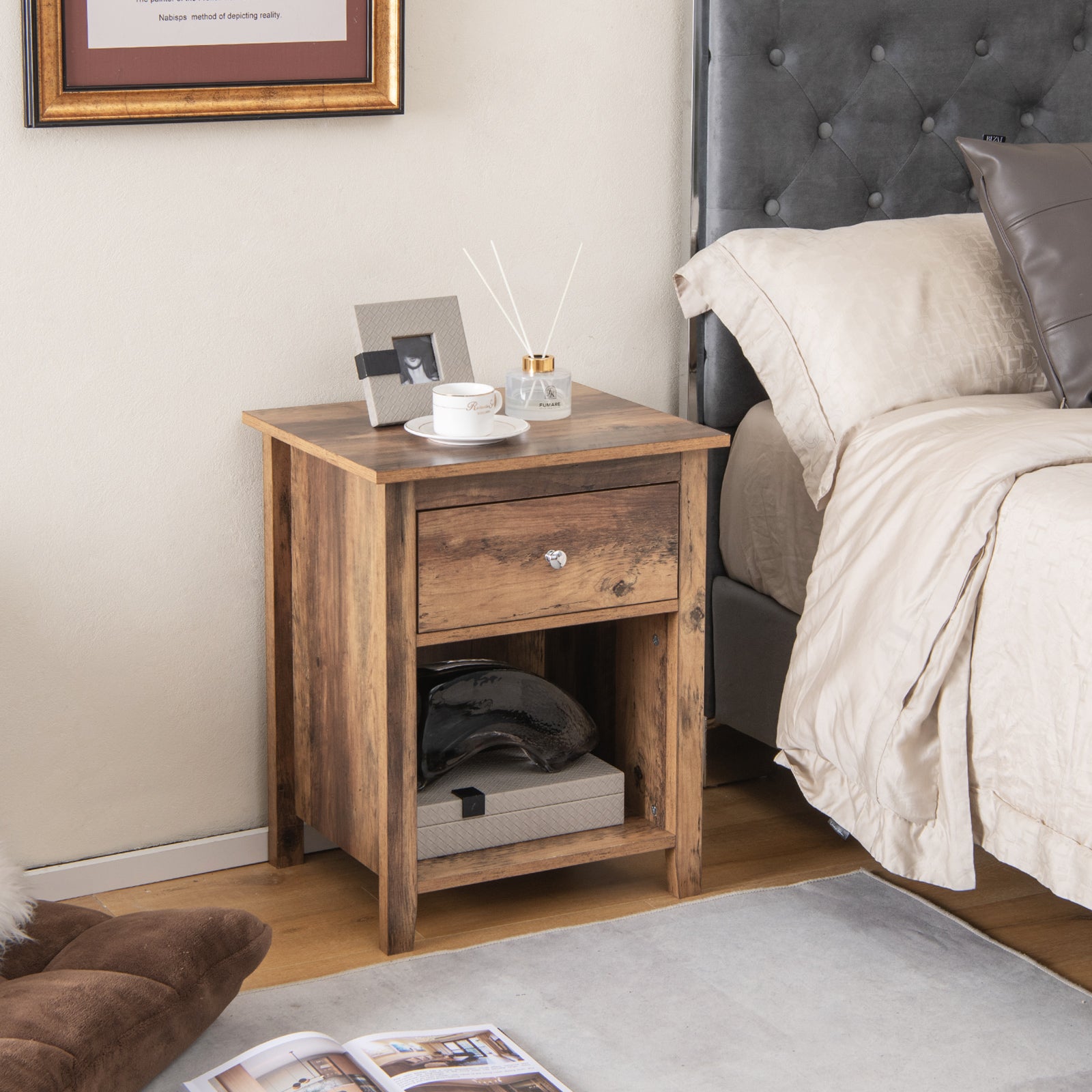 This versatile nightstand combines style and functionality, offering multiple storage options to help organize your space. The wide tabletop and open shelf provide easy access to everyday items, while the pull-out drawer offers concealed storage for more private belongings. Made from thick, durable engineered wood, this piece is built for long-term use, and its rustic design will complement a variety of home decors, making it a great addition to your living room, bedroom, or study.