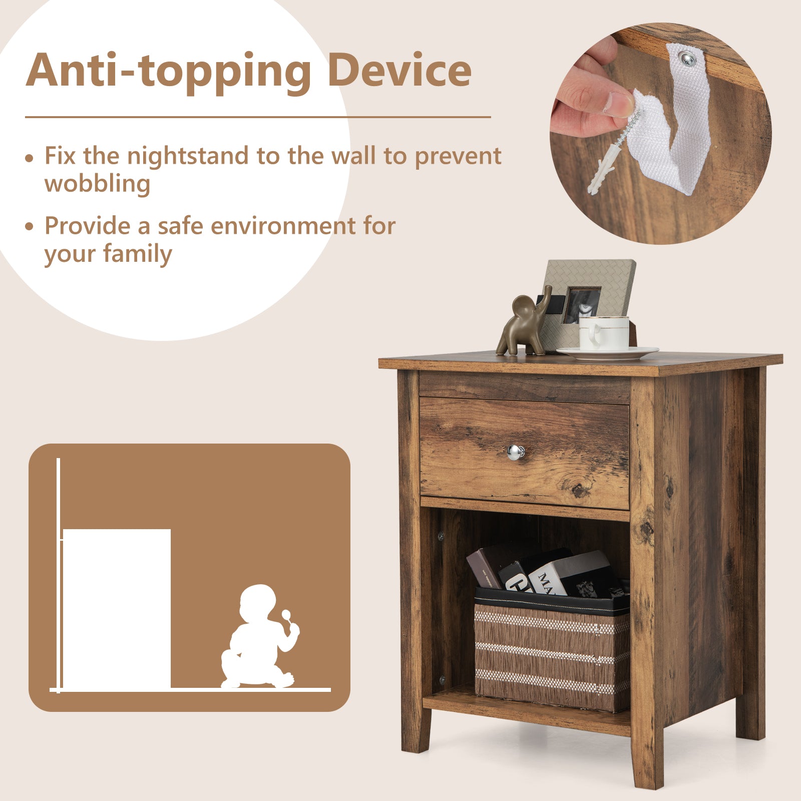 Wooden Nightstand with Slide-out Drawer and Open Shelf for Bedroom or Living Room - Rustic Brown